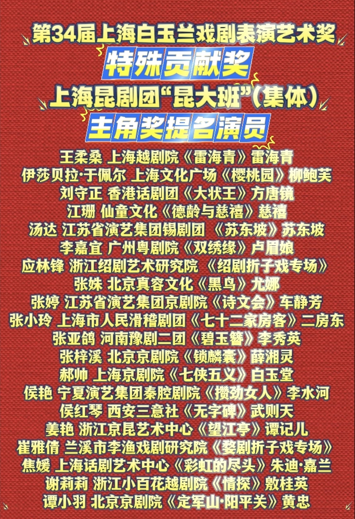 4月8日,第34届上海白玉兰戏剧表演艺术奖公布特殊贡献奖获得者与主角奖、配角奖、新人奖提名演员。